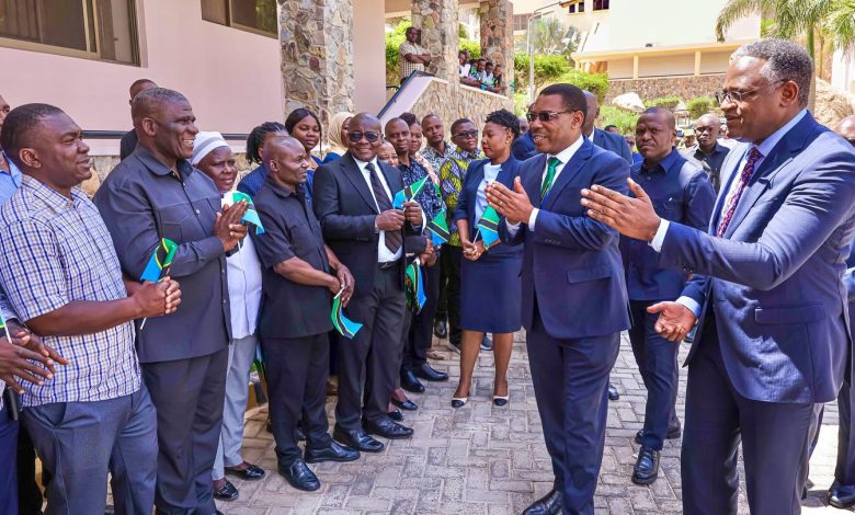 Waziri Mkuu Mteule Dk Mwigulu Nchemba akipokelewa na watumishi wa Ofisi ya Waziri Mkuu, kwenye makazi ya Waziri Mkuu Mlimwa jijini Dodoma leo Novemba 13, 2025.