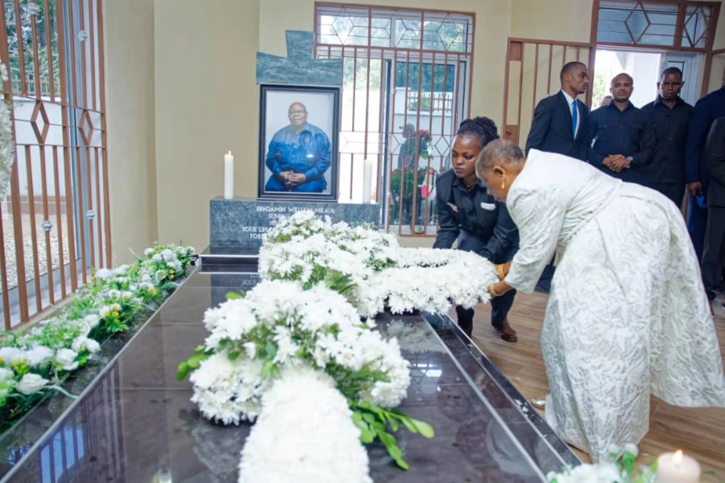 Rais Dk Mwinyi alizuru kaburi la hayati Mkapa na kuweka shada la maua, akiongozana na Rais Mstaafu wa Msumbiji, Filipe Nyusi, na kewe pamoja na Mjane wa hayati Mkapa, Mama Anna Mkapa. Hayati Mzee Mkapa alifariki dunia usiku wa kuamkia Julai 24, 2020 akiwa na umri wa miaka 81, jijini Dar es Salaam.