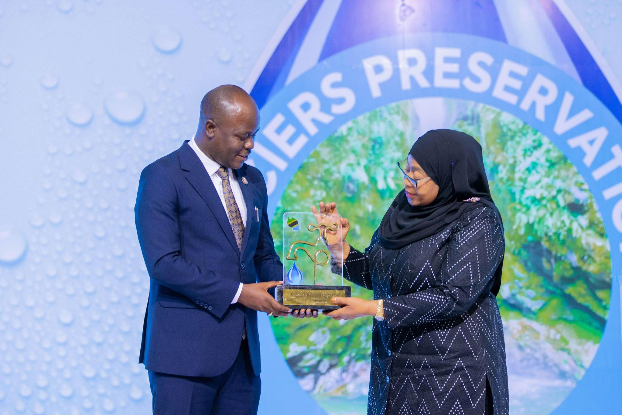 Rais Dk Samia Suluhu Hassan akipokea Tuzo ya Kinara wa Maji Afrika (The PANAFRICAN Water, Sanitation and Hygiene Champion Award) kutoka kwa Taasisi ya WaterAid UK ya nchini Uingereza wakati wa hafla ya Kilele cha Wiki ya Maji na Uzinduzi wa Sera ya Taifa ya Maji 2002, Toleo la 2025 leo Machi 22, Dar es Salaam. (Picha na Ikulu)