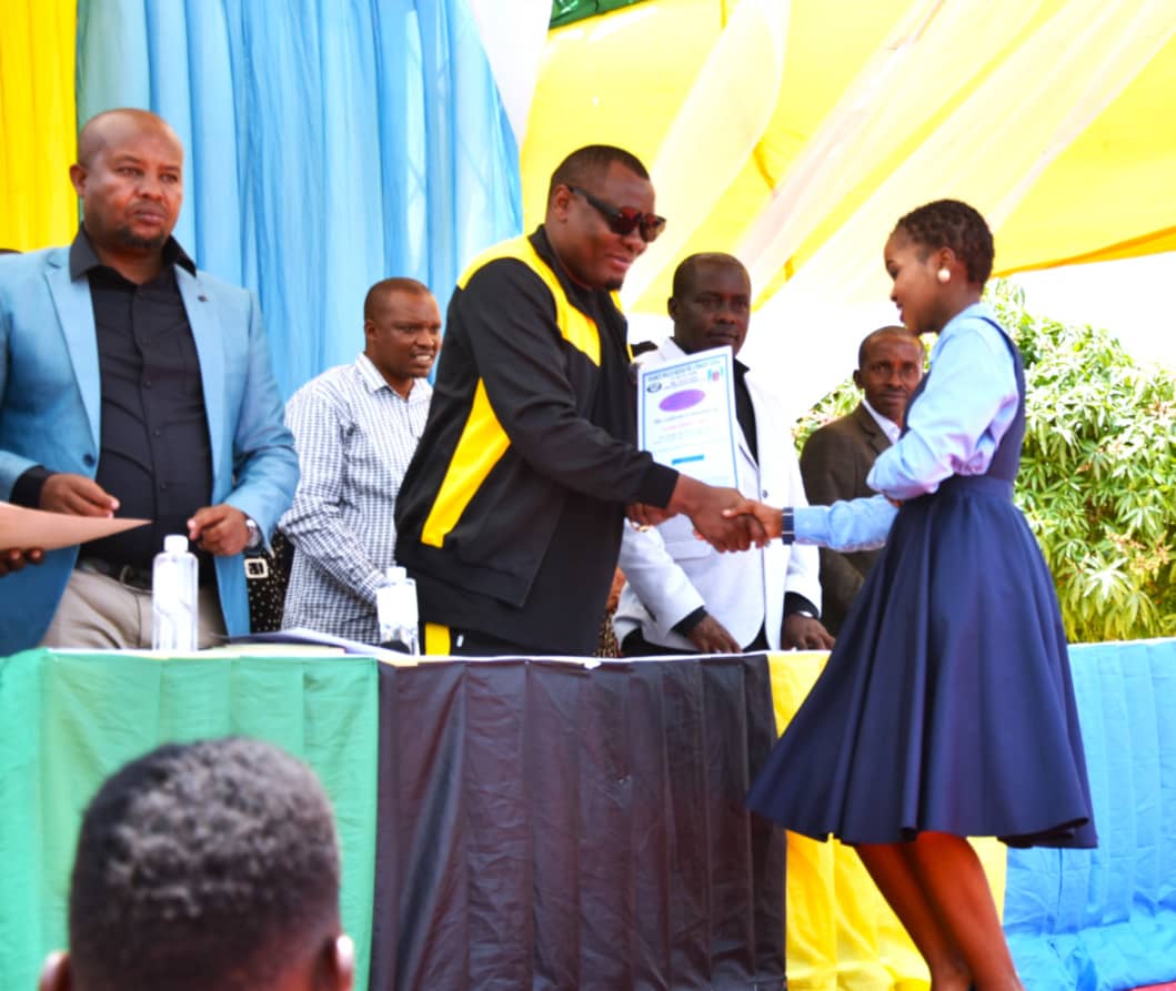 Msanii wa Muzikiwa Bongo Fleva, Clayton Chipando maarufu Baba Levo ambaye alikuwa mgeni rasmi kwenye mahafali ya nane ya Shule ya Awali na Msingi ya Ndameze akikabidhi cheti cha kuhitimu kwa mwanafunzi Veneranda Isaya (kulia) mwanafunzi aliyeongoza kwa kufanya vizuri kwenye somo la hesabu katika shule hiyo.